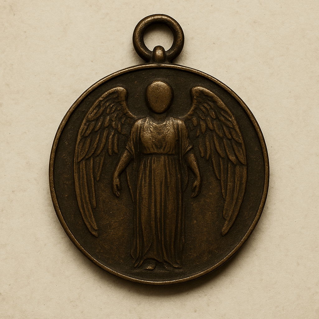 Description: A tarnished First World War medal, the bronze disc bearing a hauntingly faceless figure of Victory. The edges are worn smooth, as if handled repeatedly, and the ribbon is a faded, brittle strip of dark, blood-stained fabric. The medal bears no name or serial number, only a single, jagged scratch across its surface that almost resembles the outline of a scarecrow’s head.