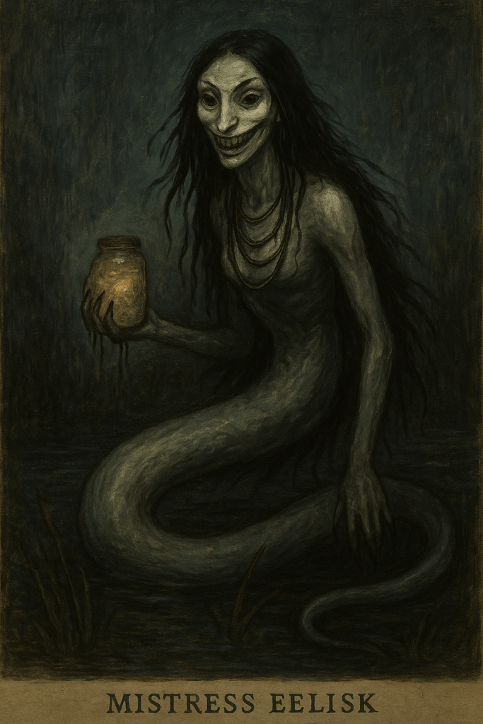 When the dying reach for words they never said… when a current hums through a dead wire… when a child speaks a secret never taught—Mistress Eelisk may be near.