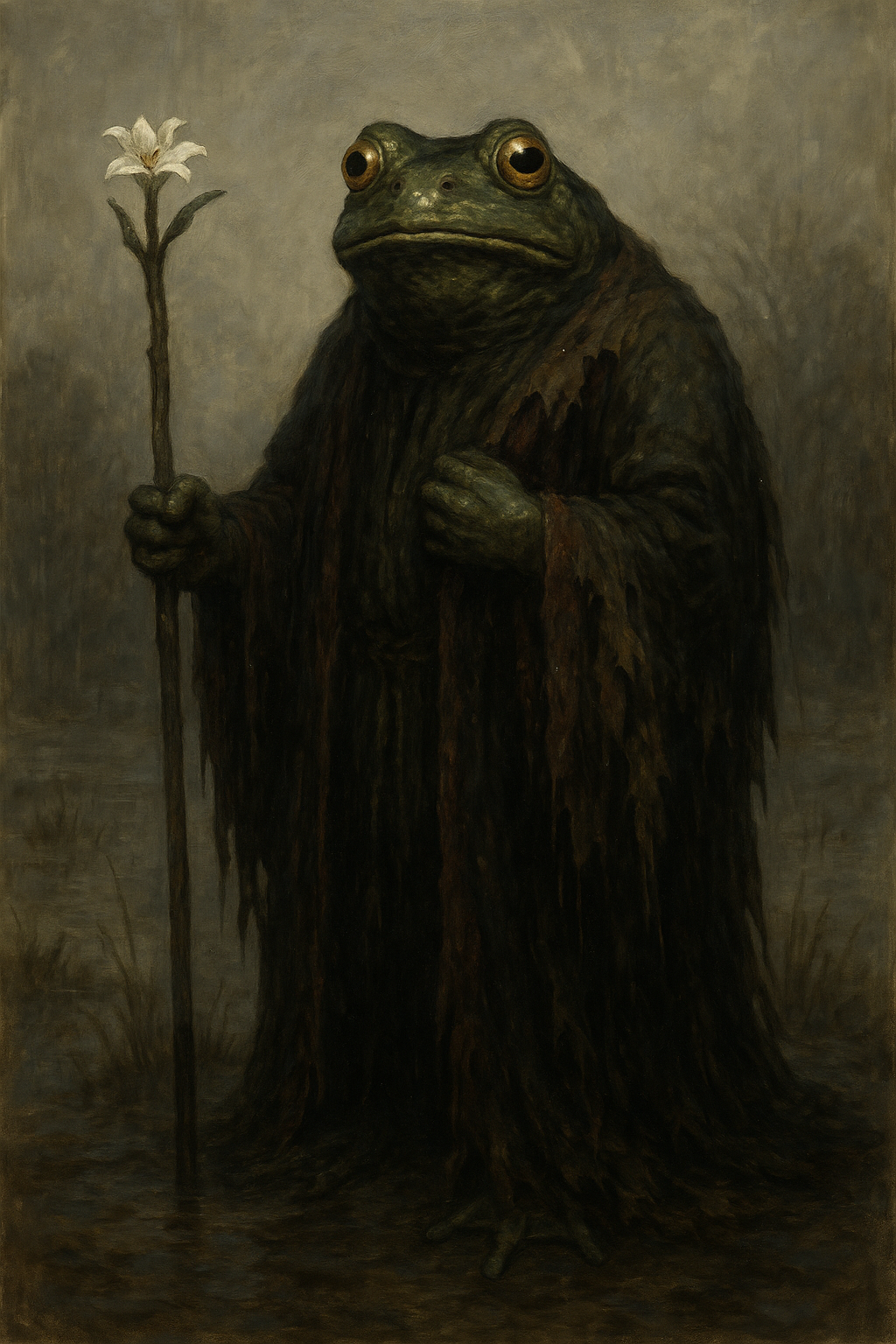 There are whispers in the mire of a humanoid frog, cloaked in velvet and regret. He appears just before the ground softens, before the words fade, before you remember what you’ve lost. This is no dream-frog or idle hallucination, but the living echo of a deeper power: