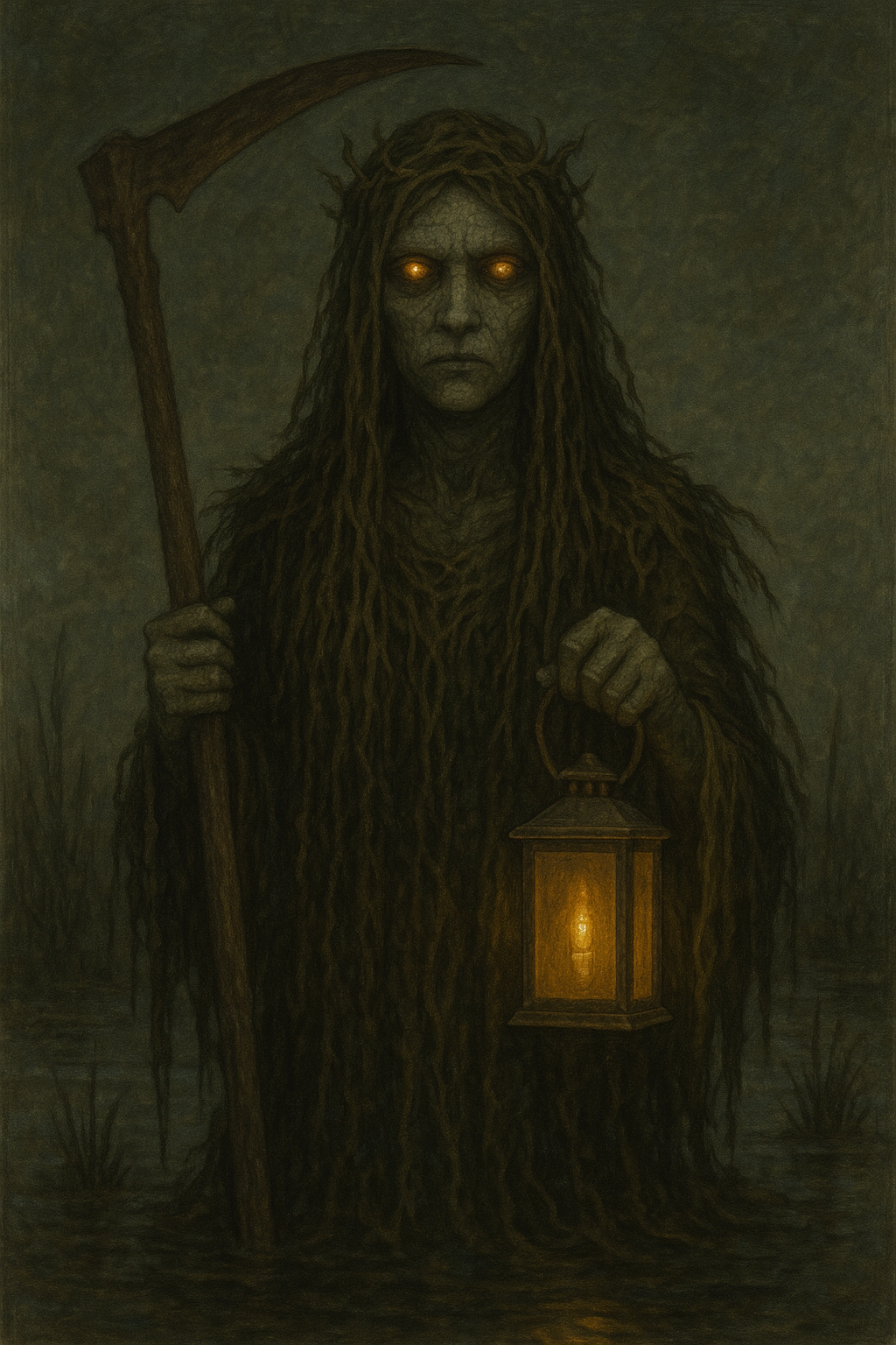 She is older, or perhaps deeper—an ancient force bound not by crown or court, but by the power of being seen. She rules from beneath the bog, half-submerged in forgotten grief. Her robes are made of peat and torn waterlilies. Her eyes are lanterns lost to the mire, glowing faintly beneath the surface. Her skin is cracked like drought-withered earth.