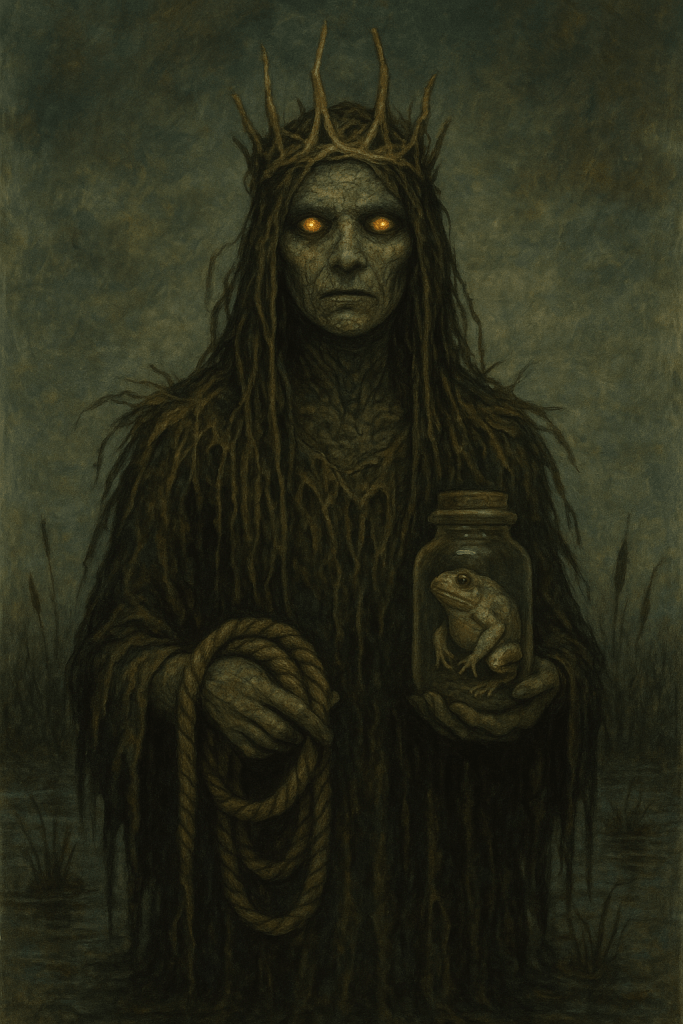 She carries no sceptre—only a coiled rope and a stillborn toad sealed in a jar.