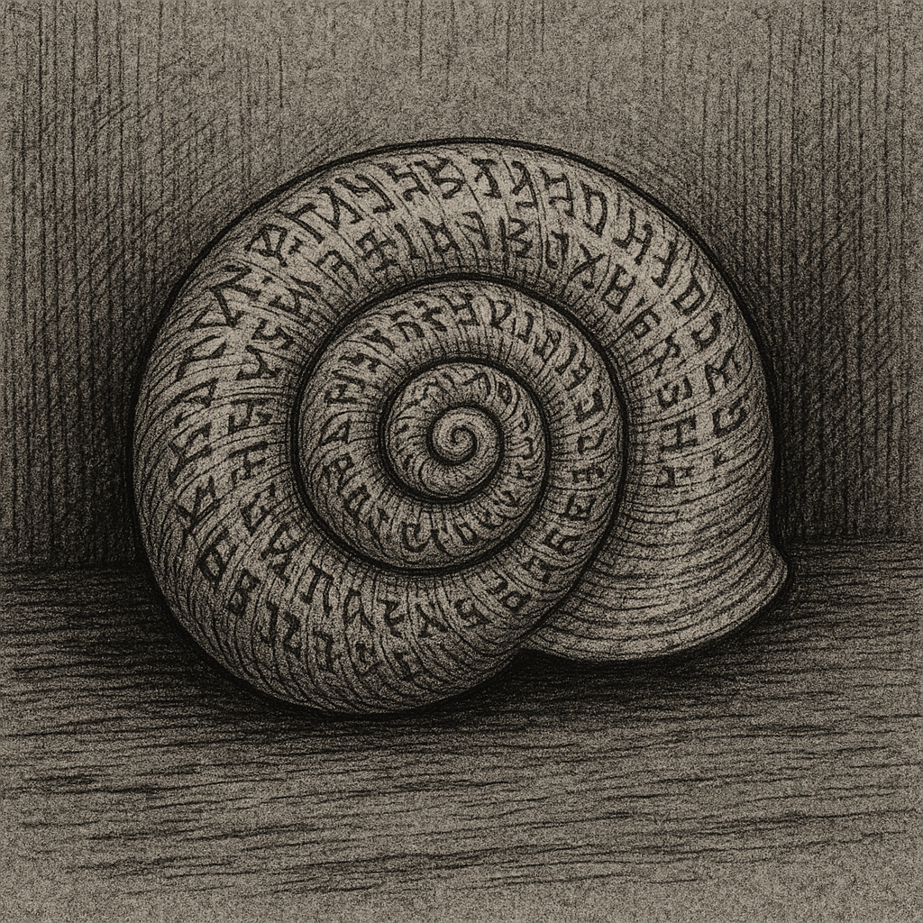 A naturally flat snail shell (5.2 cm diameter), chalk-white with faint iridescence. Surface spiral is etched with microscopic glyphs or runes of uncertain origin—these have resisted all chemical analysis and replication attempts.