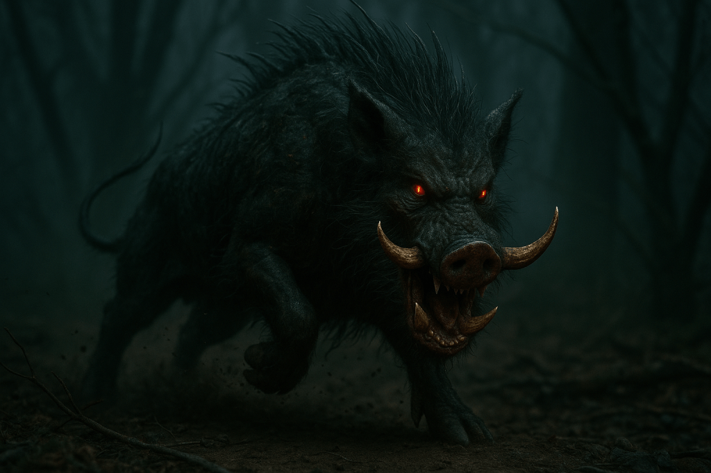 Gristlebacks are large, tusked predators from the deeper thickets of the Briar Reaches, drawn to human aggression, rage, and unresolved violence. They resemble monstrous wild boars with bark-thick hide and eyes like moss-filled hollows. Though corporeal, their presence warps tempers, incites bloodshed, and amplifies conflict. A single Gristleback appearance has turned peaceful protests into riots.