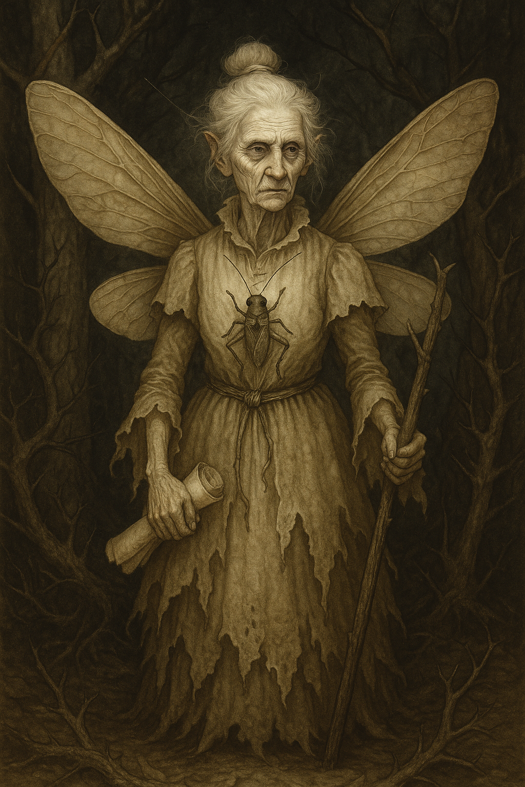 - Appearance: An ancient woman made of peat and parchment, her fingers tipped with quills, her eyes blind but ink-dark. A nest of paper birds roosts in her hair. She walks with a cane made from the spine of a forgotten book.