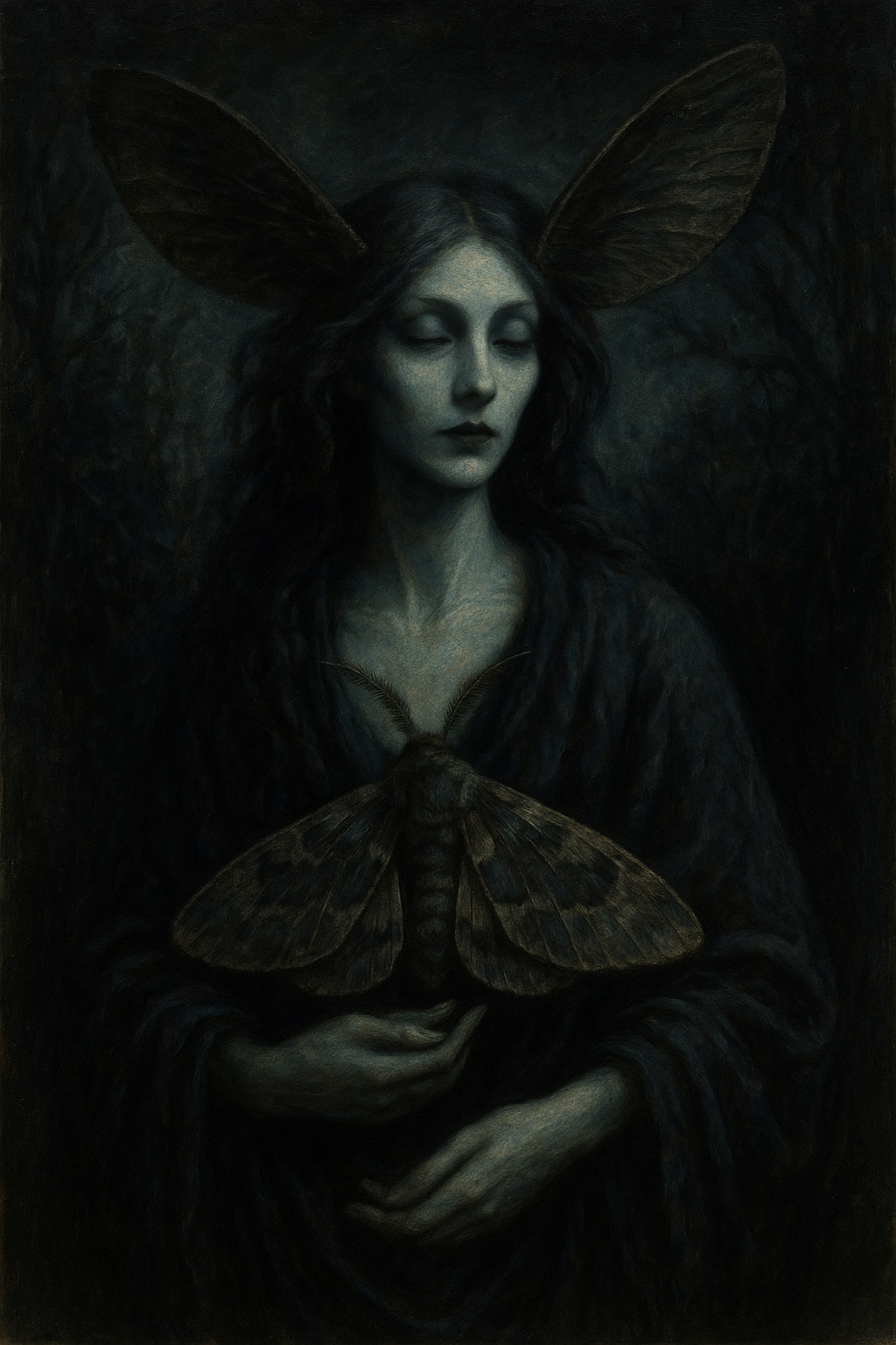 • Appearance: Humanoid but slightly wrong—skin pale as wax, eyes moonlit silver. Wings vast and velvety, mottled like bruises and shaped like windows. Dresses in nightgowns, often trailing thread or ash.