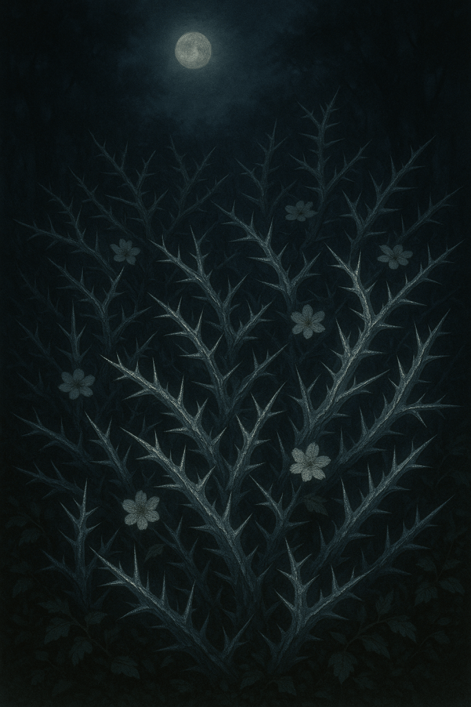 Dense thornbushes with iron-grey branches and silver-veined thorns. At moonrise, the entire bush shivers and bursts into spectral bloom—delicate, translucent flowers that shift in shape depending on who is watching.