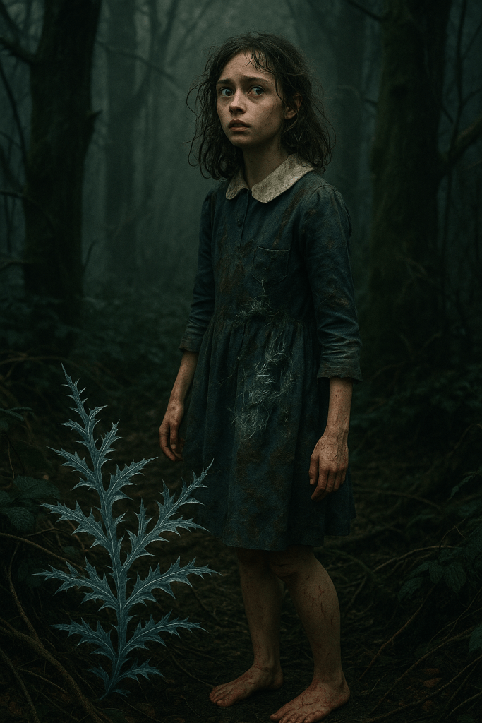 Miriam disappeared after a dispute with her mother and was missing for four days. Upon return, she was found barefoot in her school uniform, but the soles of her feet were cut with thin, mirror-like slices. She had lost the ability to speak but scratched patterns into any soft surface resembling Mistglass Fern fronds.