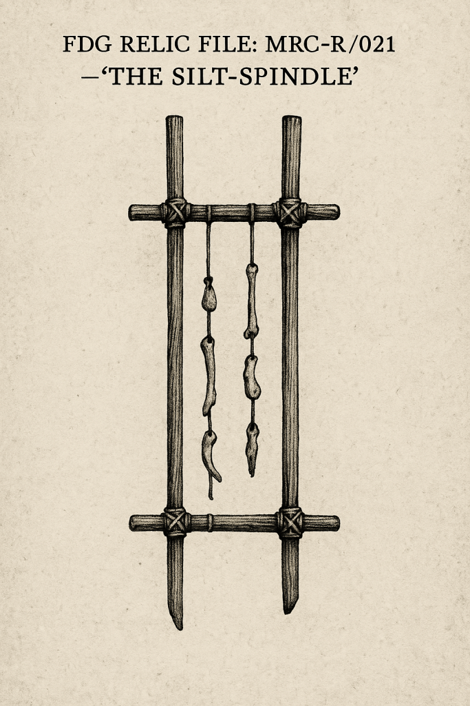 Local lore and operative interviews suggest the spindle can be used to summon an entity referred to as “Sir Croakemire” when spun over an open flame, particularly oil or lantern fire. Entity believed to be a watcher-class emissary of the Mirecourt. Summoning results have not been intentionally tested since 1987.
