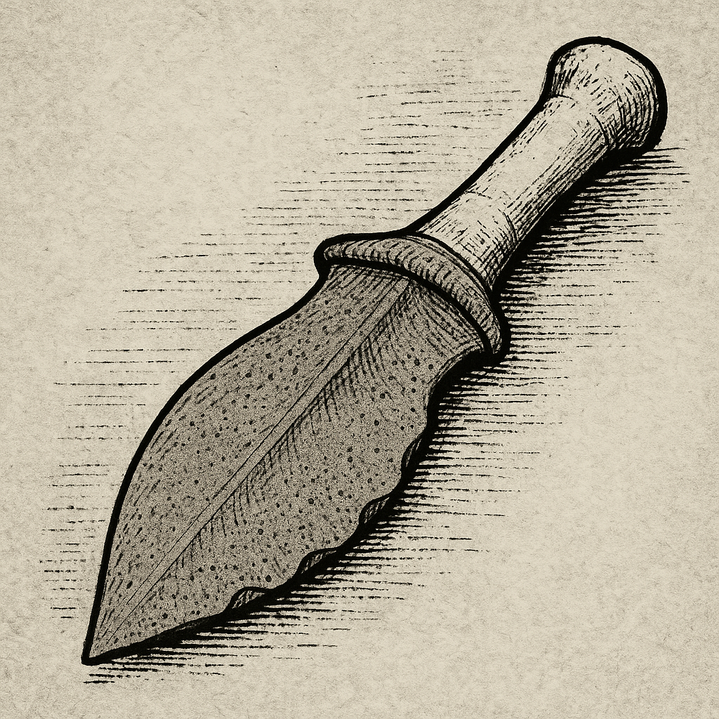 A ritual blade approximately 18 cm in length, fashioned from fired clay and bleached bone. Shaped in the abstract form of a leaf or fish fin, with one edge bearing uneven serrations. Despite appearing blunt or dulled, the blade penetrates as if sharpened, though no incision is visible post-contact.