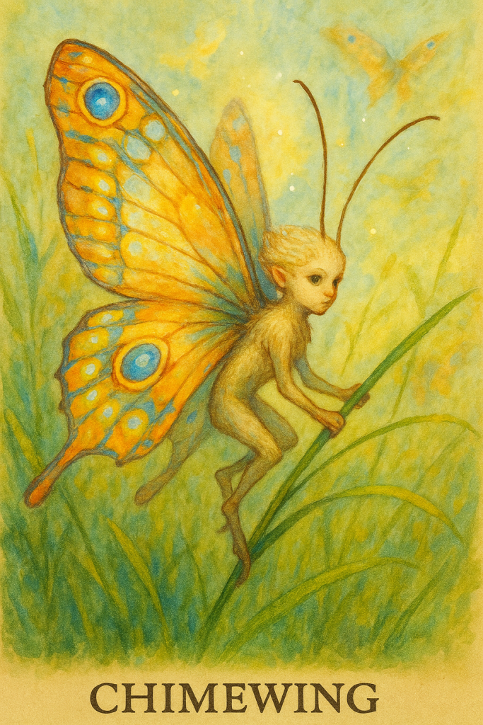 Chimewings are ethereal butterflies with cracked-glass-like diaphanous wings tipped with tiny silver bells. Their flight is graceful and silent, gliding on air currents without visible wing beats. When disturbed, the bells produce a sound perceptible only internally to the observer.