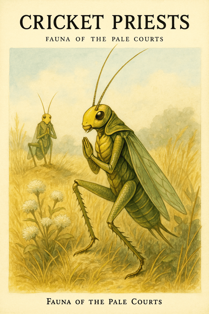 These large, deep purple crickets inhabit shaded hollows of the Pale Country, forming congregations reminiscent of choirs. Their limb-rubbing produces unique tonal sequences, which are inaudible or nonsensical to most humans but can be interpreted by those sensitive to fae magics as liturgical chants.
