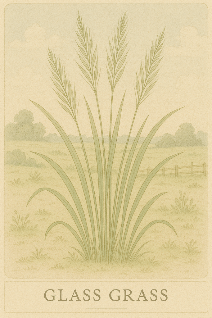 Glassgrass is a crystalline grass species native to the Pale Country, known for its delicate, shimmering blades that produce a soft tinkling sound when moved by the slightest breeze. It thrives in areas where temporal loops and mirrored realities overlap.
