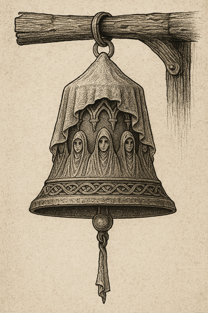 Recovered from the depths of a Pale Country ritual chamber associated with the Silent Choir. The bell was found resting atop a pedestal of alabaster, surrounded by faded inscriptions invoking silence and watchfulness.