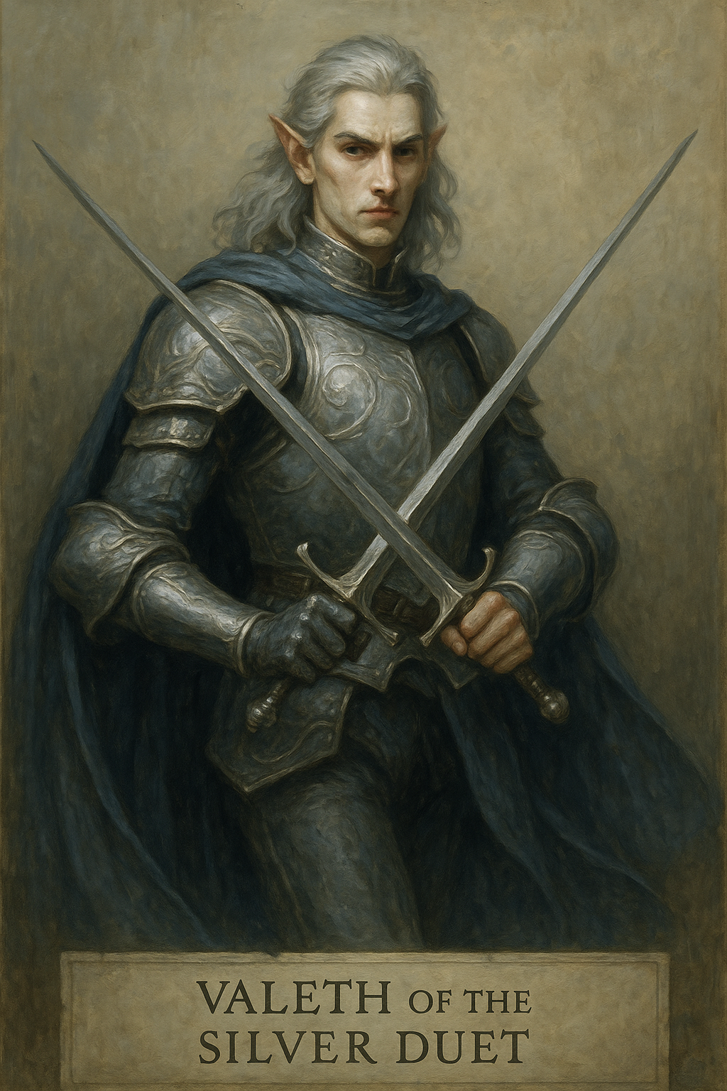 Valeth is revered by courtiers and feared by rivals. He is the embodiment of grace, pain, and submission to form. He has not spoken in centuries, though sometimes, as his blade arcs in a ghost-strike, witnesses claim to hear a whisper in the clash: “Forgive me.”