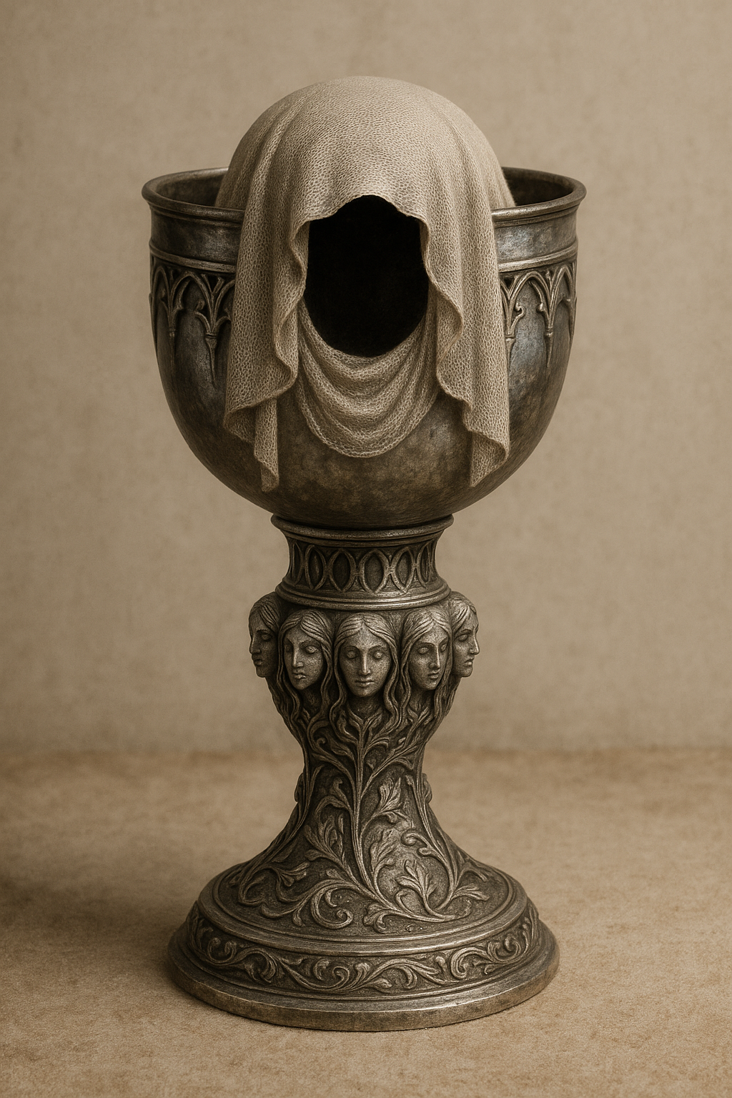 An ornate silver chalice with intricate, silent carvings around its rim and body. Despite its detailed craftsmanship, the chalice bears no inscriptions. The vessel seems to shimmer faintly and sometimes contains liquids that shift color and consistency without settling. It is associated with the court’s oracles who were said to have lost their tongues.