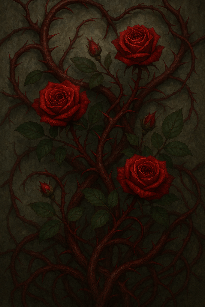These deep-crimson vines coil like veins across broken stone and gnarled trees. Their blooms resemble roses but glisten wetly even in drought. At night, the petals close and the vines pulse faintly as if breathing.
