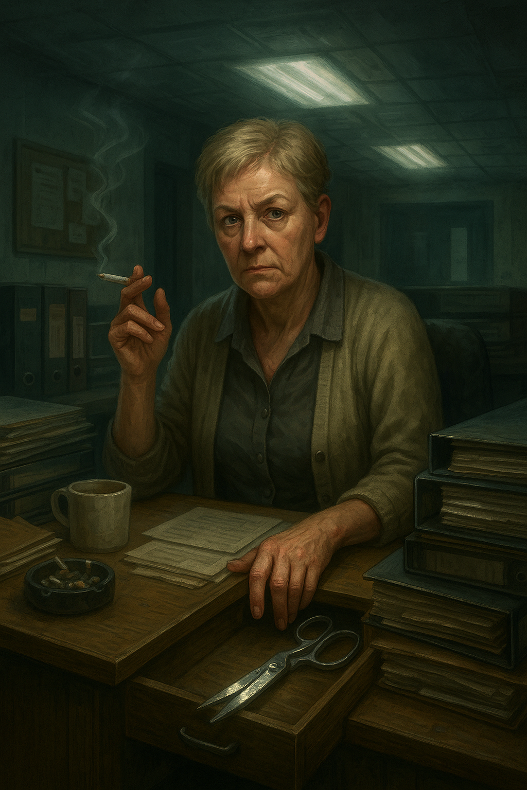 Her desk drawer contains an unmarked personnel file from 1991, several broken name badges, and a perfectly polished pair of iron scissors.