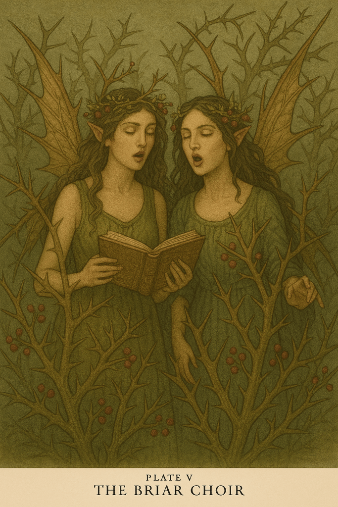 Believed composed of mortal and fae spirits impaled upon thorns — trapped consciousnesses that linger as part of the plant structure. The Choir “sings” when the wind passes through its vines, sometimes forming recognisable words or imitating known voices.