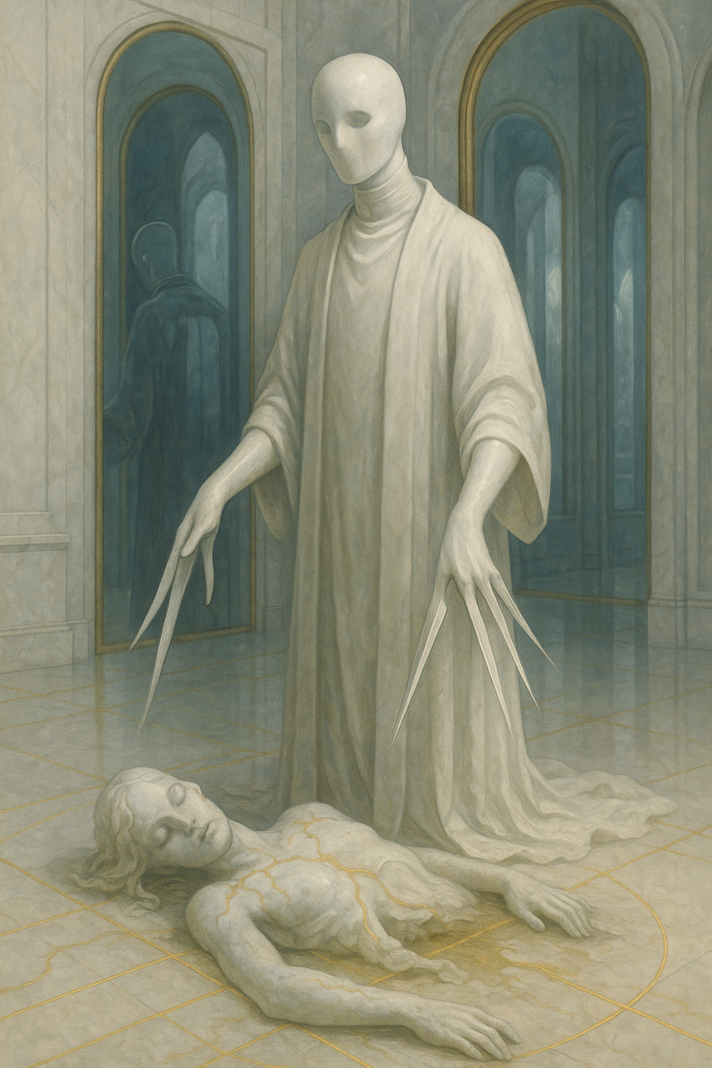 Manifestation appears as a tall humanoid form in white robes or surgical vestments, with a face of unbroken alabaster. Limbs unnaturally smooth; digits taper into fine metallic blades that unfold seamlessly from beneath the skin. Operates within structures of mirrored light or sterile radiance.